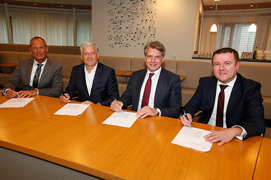 Het officiële tekenmoment van de overname van UMG door Aon. Van links naar rechts op de foto: Rutger Zomer, CFO Aegon Nederland, Maarten Edixhoven, CEO Aegon Nederland Marc van Nuland, CEO Aon Risk Solutions en Rogier Sparreboom, CFO Aon Benelux.