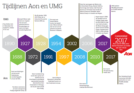 Bovenstaande tijdlijn toont de geschiedenis van Aon en UMG in Nederland. De afbeelding is in hoge resolutie te downloaden door erop te klikken.