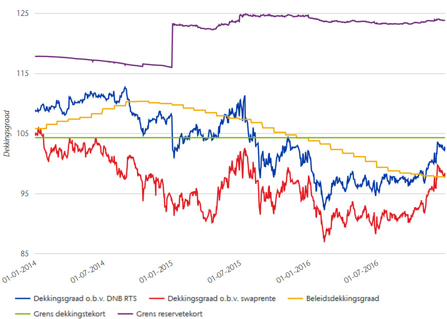 De beleidsdekkingsgraad, gebaseerd op de gemiddelde dekkingsgraad van de afgelopen twaalf maanden en leidend voor kortingen of indexatie, is in 2016 gedaald van 104% naar 98%. Dit is lager dan het wettelijke vereiste minimum van 104,3%. De verwachting is dat veel fondsen het jaar afsluiten met een reservetekort en dat sommige fondsen zich in een dekkingstekort bevinden. Dat betekent dat zij vóór 1 april 2017 een nieuw herstelplan moeten indienen.