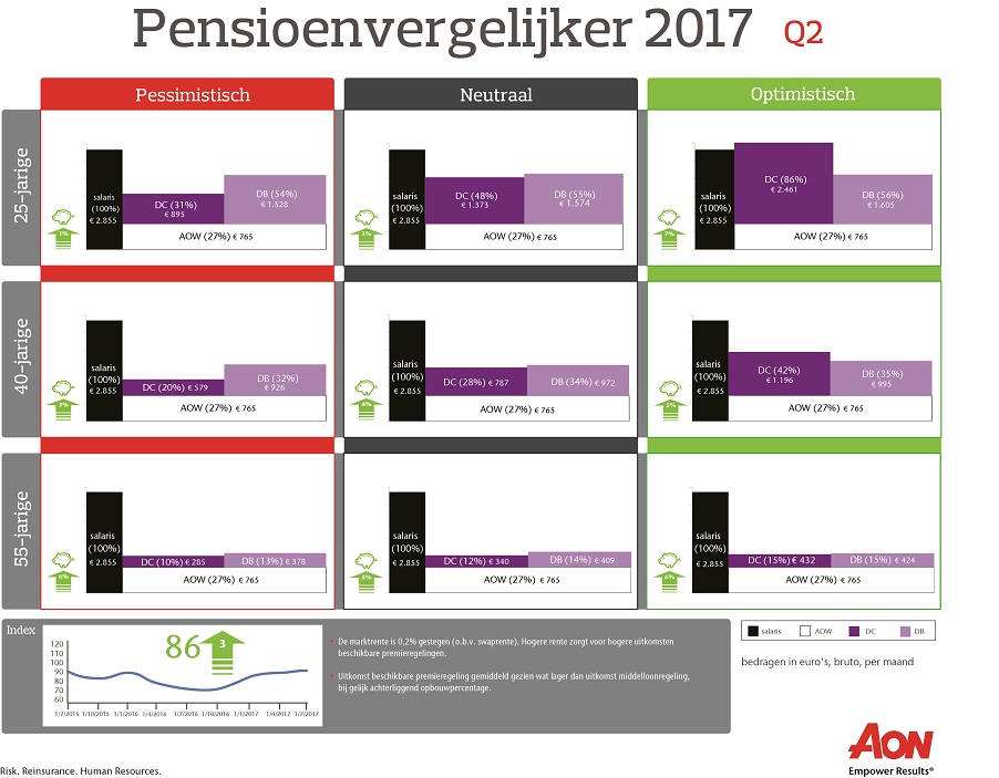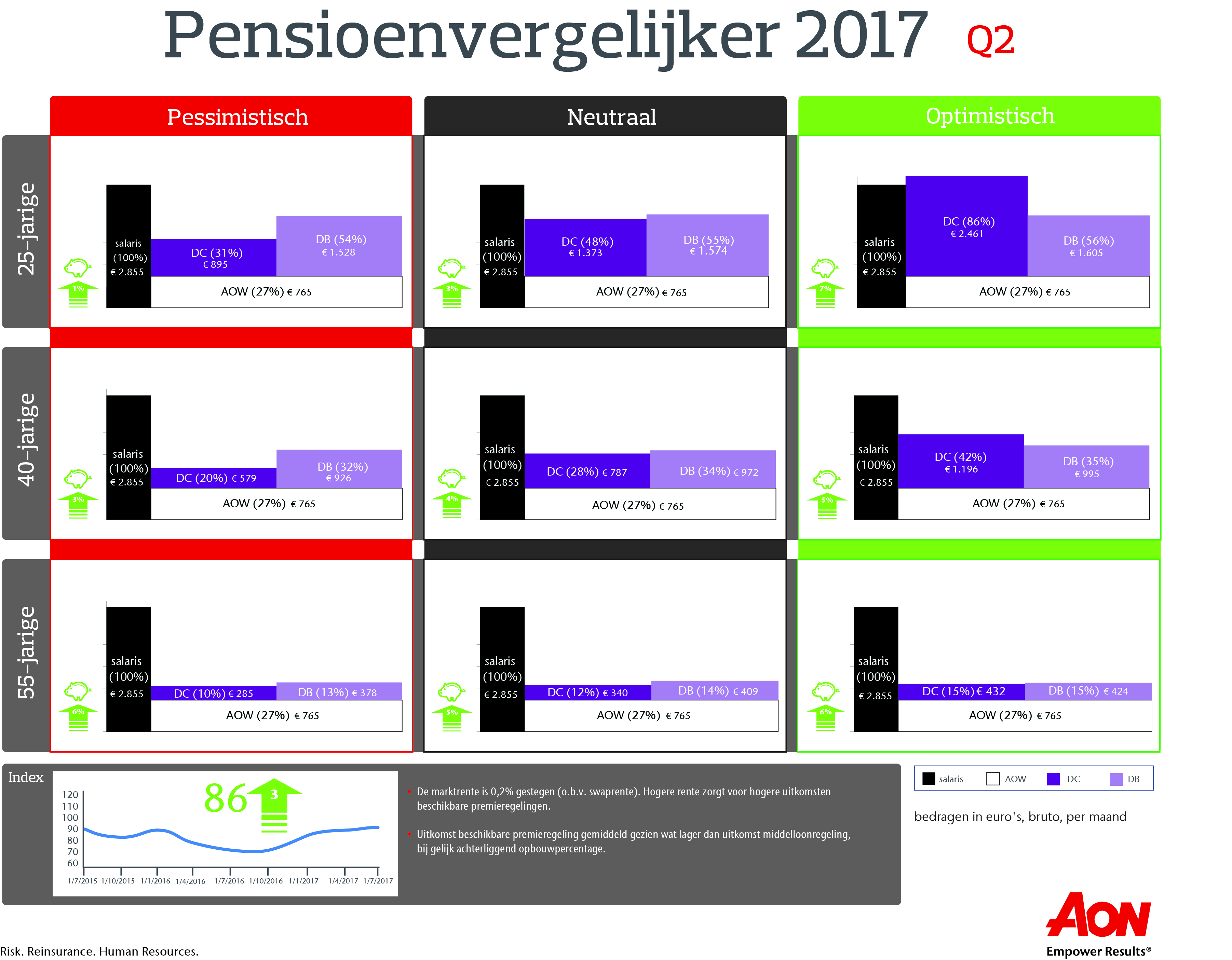 Dat blijkt uit de Pensioenvergelijker van Aon, wereldwijd marktleider op het gebied van risk, retirement en health. De Pensioenvergelijker is een index waarmee Aon ieder kwartaal de potentie van beschikbare premieregelingen peilt.