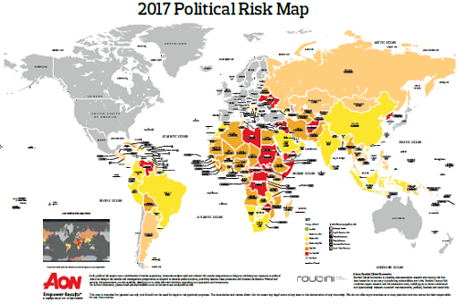 De Aon Political Risk Map brengt veranderende risico’s in beeld voor organisaties en landen in opkomende economieën (niet-OESO landen). De kaart wordt gemaakt samen met Roubini Global Economics. Deze editie markeert het twintigjarig bestaan.
