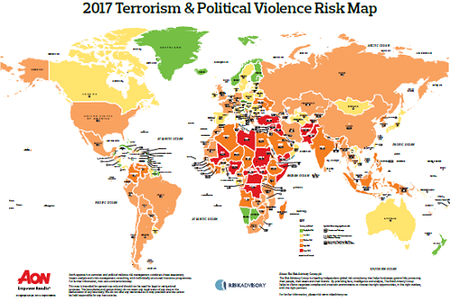 De Aon Terrorism & Political Violence map geeft een gedetailleerd beeld van terroristische dreigingen en politiek geweld wereldwijd, gebaseerd op empirische bevindingen en inlichtingen. De kaart wordt geproduceerd sinds 2007 in samenwerking met The Risk Advisory Group.