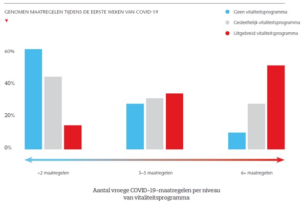 Uit onderzoek van Aon blijkt dat veel werkgevers onvoldoende voorbereid waren op de huidige situatie, ook gezien de mate waarin er vooral al initiatieven genomen waren om de vitaliteit en gezondheid van medewerkers te ondersteunen. Het onderzoek toont aan dat organisaties die vóór de coronacrises al een vitaliteitsbeleid hadden, meer maatregelen hebben getroffen en sneller konden handelen dan organisaties die geen vitaliteitsbeleid hadden.