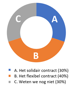 Ondanks de meningen van experts die de voordelen van het flexibele contract zien en dit misschien als het meest transparante en eenvoudige contract zien, zien veel fondsen ook de voordelen van het solidaire contract. Hierin kan door het opheffen van de leenrestrictie en het vormen van een solidariteitsreserve welvaartswinst behaald worden. Uit een enquête onder onze klanten blijkt dat beide contracten ongeveer even populair zijn. Grofweg 30% van de ondervraagde klanten denkt naar het solidaire contract te gaan, grofweg 40% naar het flexibele contract en de overige 30% weet het nog niet. Er lijkt dus op dit moment geen uitgesproken voorkeur voor één van de twee contracten te zijn.