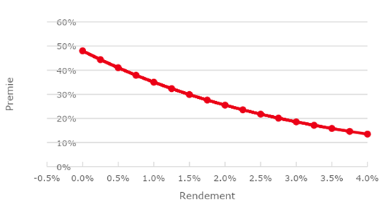 Momenteel ligt het huidige renteniveau al boven de 2%. De 30-jaarsrente per eind september is 2,23%. Het projectierendement ligt daar nog boven. Een verhoging van de rente van 1,5% naar 2,23% betekent grofweg al een verlaging van de fiscale premiegrens naar 23,4% (zie ook de grafiek uit de Memorie van Toelichting).