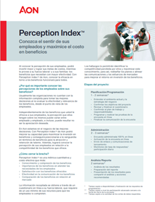 Con Perception Index™ de Aon, los beneficios funcionarán para todos. Al conocer la percepción de sus empleados, podrá invertir mejor y lograr sus metas de costos, mientras le provee a su fuerza laboral los beneficios que necesitan con mayor efectividad.