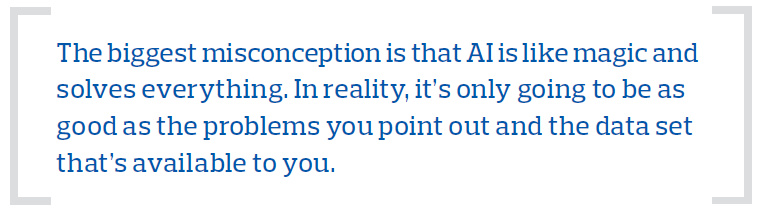 A: The biggest misconception is that it’s magic and solves everything. In reality, machine learning or artificial intelligence is only going to be as good as the problems you point out and the data set that’s available. Artificial intelligence does not have the ability to explore outside the dataset. It can learn from that dataset but if not given the right questions or a skewed set of data, you can easily become misinformed.