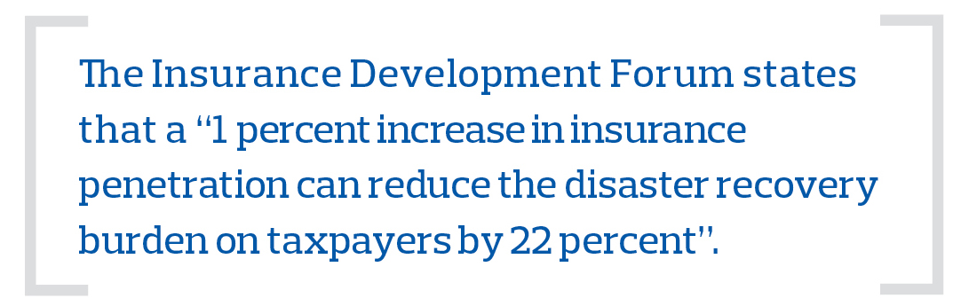 The insurance industry has been innovating to solve this problem for years, and with increasing pressure from governmental organizations to increase resilience, the opportunity for the industry to drive solutions has never been better. The Insurance Development Forum (IDF) was launched in 2016 explicitly as an answer to the resiliency challenges laid out in various global agreements, such as the Paris Agreement and the U.N. Sendai Framework for Disaster Risk Reduction 2015-2030. The IDF states that a “1 percent increase in insurance penetration can reduce the disaster recovery burden on taxpayers by 22 percent”.
