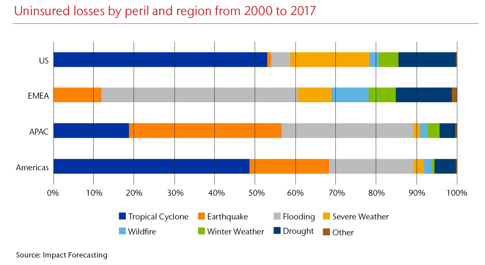 Every year catastrophes wreak havoc on people in every corner of the globe, and the consequences are getting worse. The frequency of natural disasters is increasing, and the damage they cause will be greater as the world population becomes more urban and concentrated in areas prone to catastrophe. In 2017, five wildfires made the top 20 list of the most destructive in California’s history. Hurricane Harvey resulted in 60 inches of rain inundating Houston, TX, easily beating the prior record set in 1978. Puerto Rican officials can finally claim that power has been restored to 100 percent of its residents nearly one year after Hurricane Maria devastated the island. Flooding in China, an earthquake in Mexico, and an extreme drought in southern Europe all add up to $368 billion in economic losses; the second-highest year for natural disasters globally.