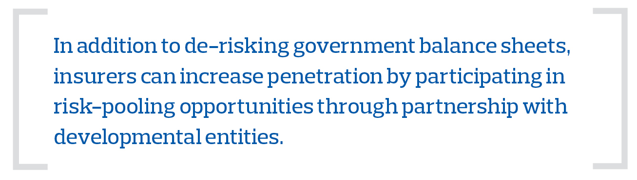 U.S. Treasury to the tune of $23 billion, prompting the NFIP to purchase $1 billion of reinsurance to transfer the risk. The agreement was in place in time to fully protect the NFIP for losses from Hurricanes Harvey and Irma in 2017, saving taxpayers approximately $850 million. In addition to de-risking government balance sheets, insurers can also increase penetration by participating in risk-pooling opportunities through partnership with developmental entities, for example, the historic $1.36 billion in earthquake protection provided to Chile, Colombia, Mexico, and Peru by the World Bank.