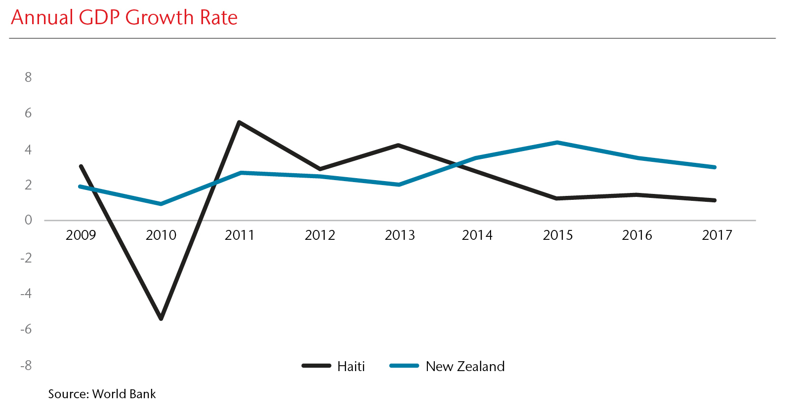 A case in point is provided by comparing New Zealand and Haiti. Both are earthquake-prone island nations that were struck with large earthquakes in 2010 and 2011, but the recovery of both nations has contrasted starkly, in part because of the difference in insurance penetration. The sizable difference in overall economic standing must be considered when comparing the recovery of both nations. However, this does not diminish the impact that insurance has had on long-run growth in both nations.