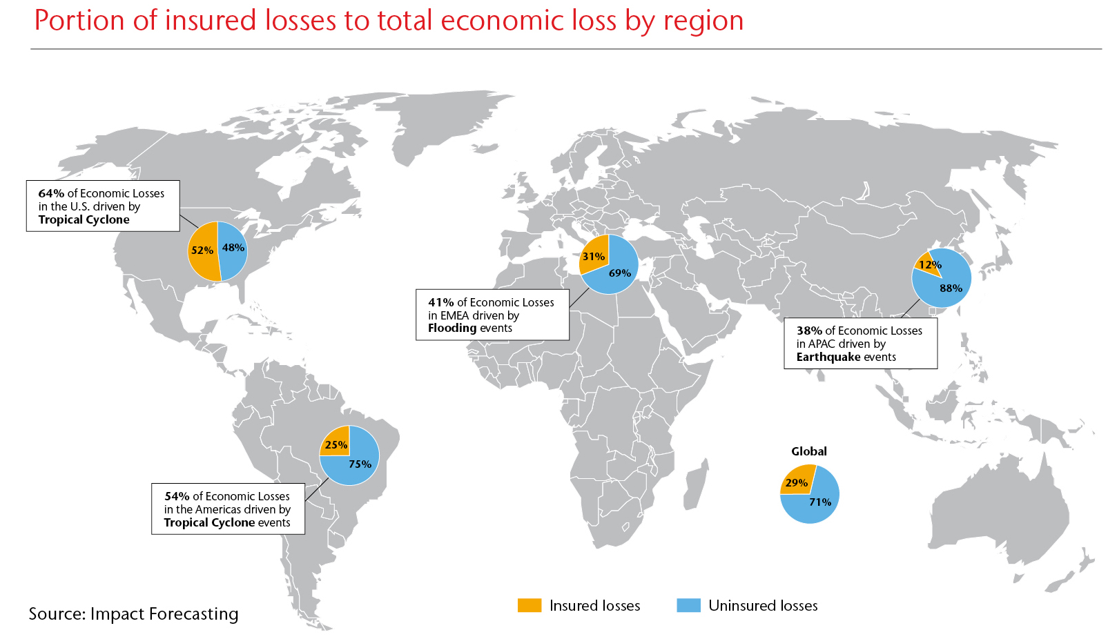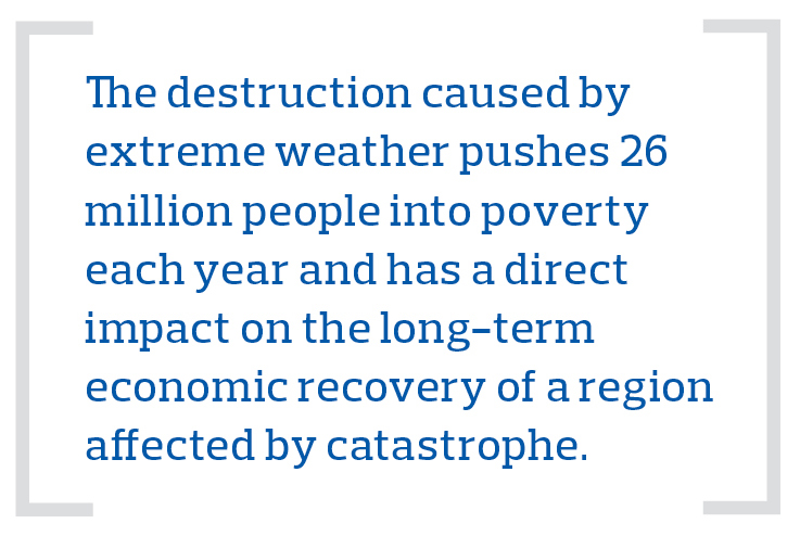 Insurance is an essential part of a community’s resilience, but last year the insurance industry covered less than 40 percent of the losses, leading to a global insurance protection gap of $231 billion. The protection gap is the difference between the economic loss of a catastrophe and the amount that is covered by insurance, and it can include clean-up costs, uninsured property damage, damaged infrastructure, emergency relief, and foregone revenues. Government programs can fill the gap in developed regions, but increasingly, these costs are being borne by the most poor and vulnerable members of our society. According to the World Bank, the destruction caused by extreme weather pushes 26 million people into poverty each year and has a direct impact on the long-term economic recovery of a region affected by catastrophe. In the absence of sufficient insurance coverage, the impact on economic growth can be not only detrimental in the short-term, but permanent.