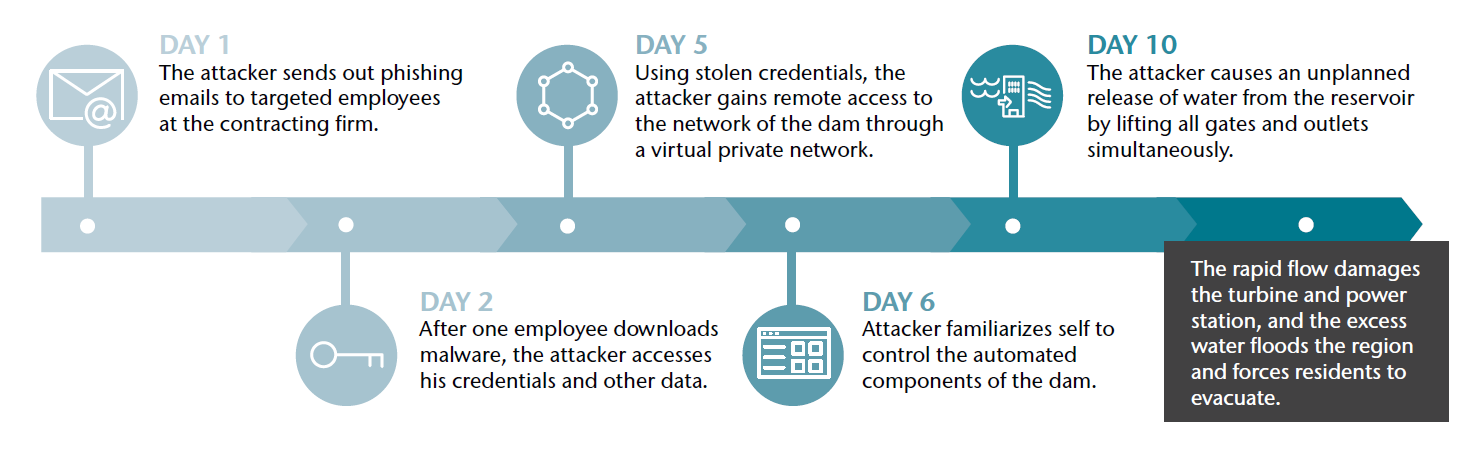 In these scenarios, a threat actor seeks to create massive disruption in the U.S. by causing flood damage. The threat actor identifies an engineering firm that has been contracted to support the IT systems at a hydroelectric dam, and through carefully crafted phishing emails, gains access to the engineers’ system. Once in the engineers’ network, the threat actor waits for an engineer to log in remotely to the dam’s control systems and captures their login information. The threat actor then uses these credentials to access the system.