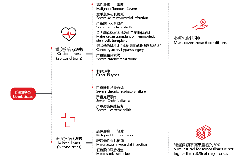 - Expand standard CI diseases from 25 to 28 conditions. There are six compulsory conditions, i.e., malignant tumor, acute myocardial infarction, stroke sequelae, major organ transplant or hemopoietic stem cells transplant, coronary artery bypass surgery, and severe chronic renal failure.