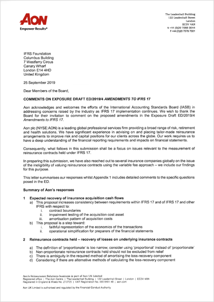 Aon comment letter on the IASB's proposed amendments to IFRS 17