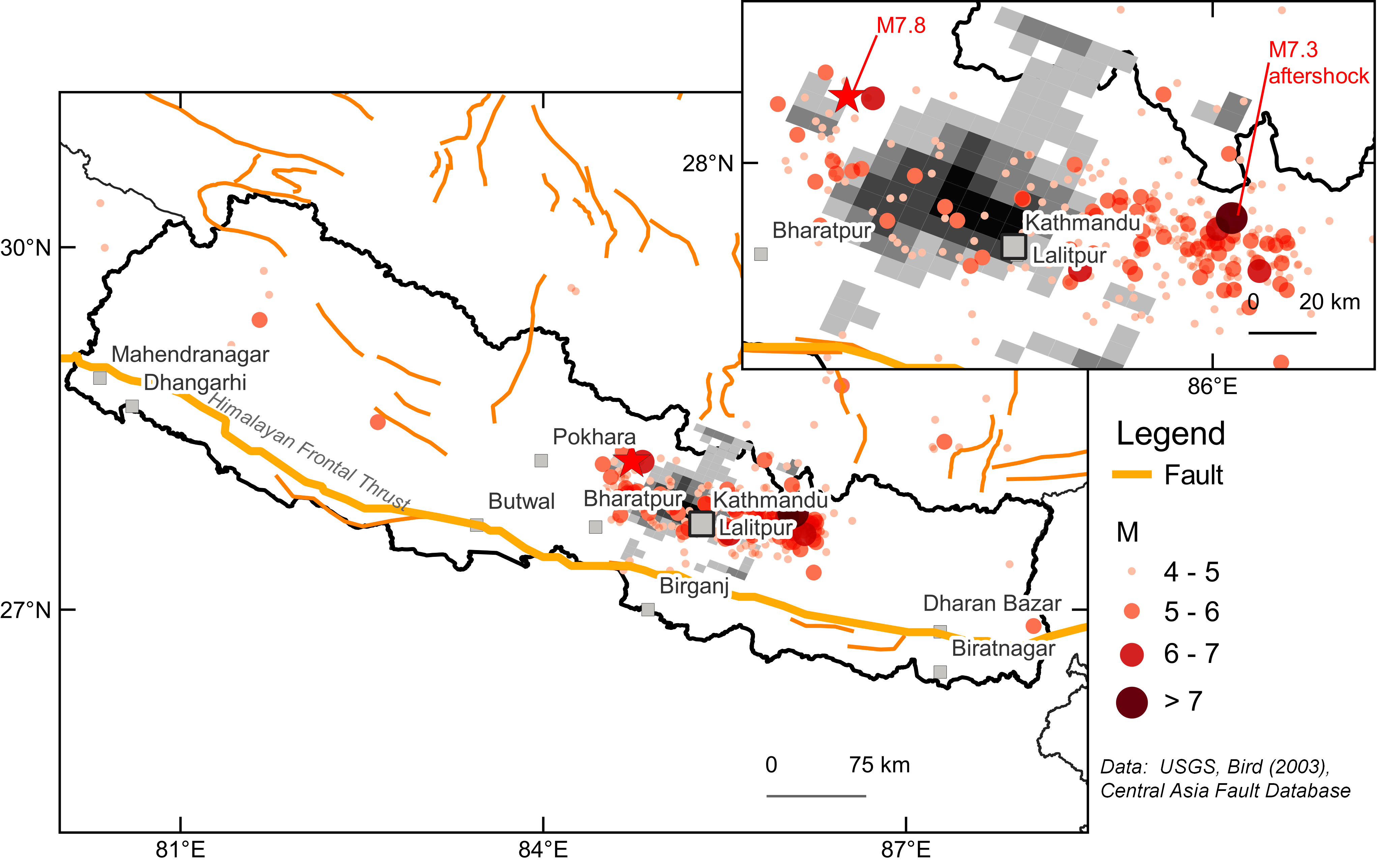 On April 25, 2015, a magnitude M7.8 earthquake struck the Kathmandu region of Nepal. This was the strongest to occur since the 1934 M8.0 Nepal-Bihar earthquake. The epicentre of the earthquake was 77 km northwest of Kathmandu, the capital city of Nepal, at a depth of about 15 km. The earthquake occurred at the subduction interface along the Himalayan arc between the Indian plate and the Eurasian plate. In the following days numerous aftershocks were felt across Nepal, including additional M7.3 and M6.7 earthquakes on May 12, 2015. These aftershocks caused additional damage to rural towns and villages in the northern part of Central Nepal.