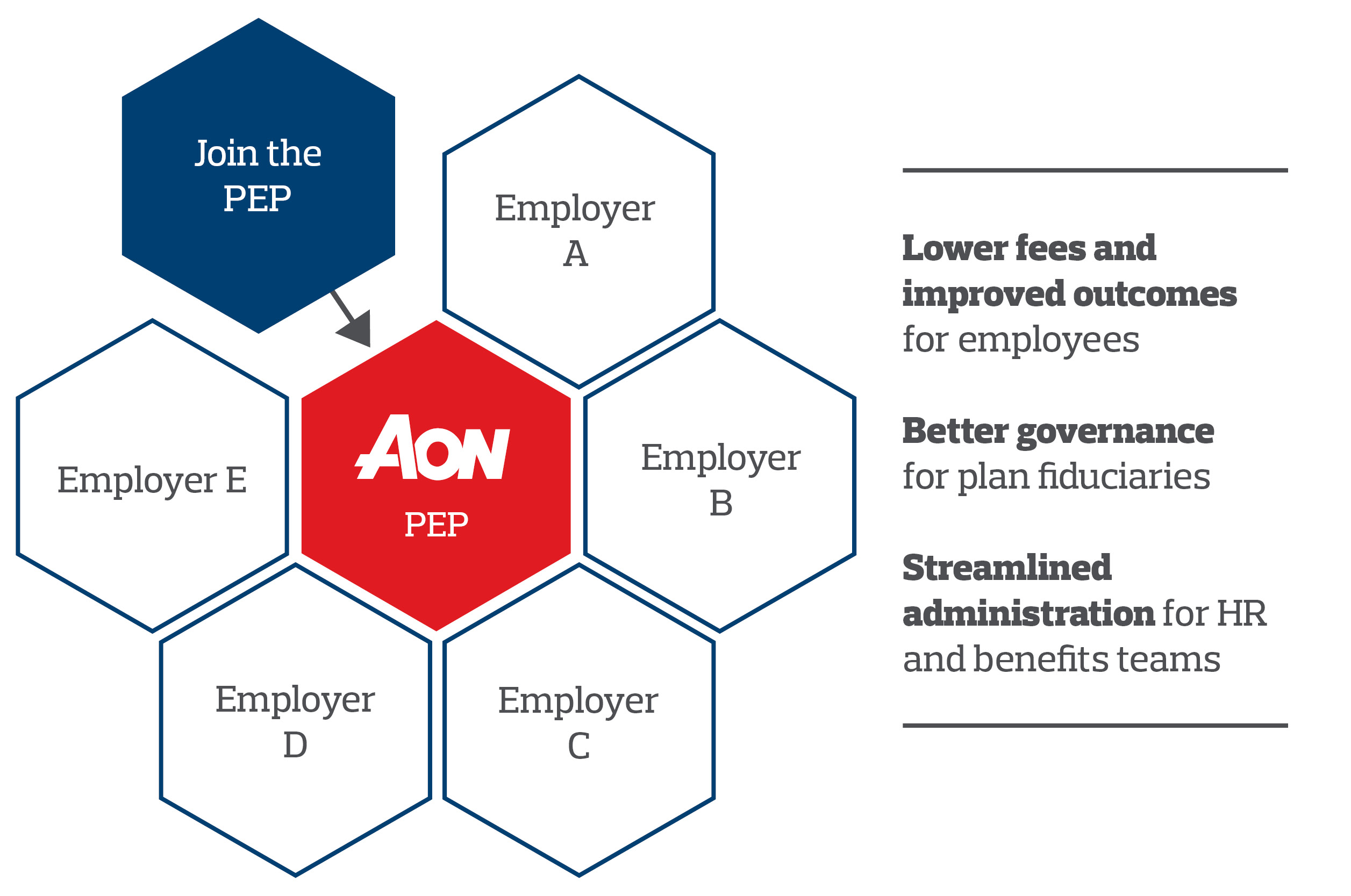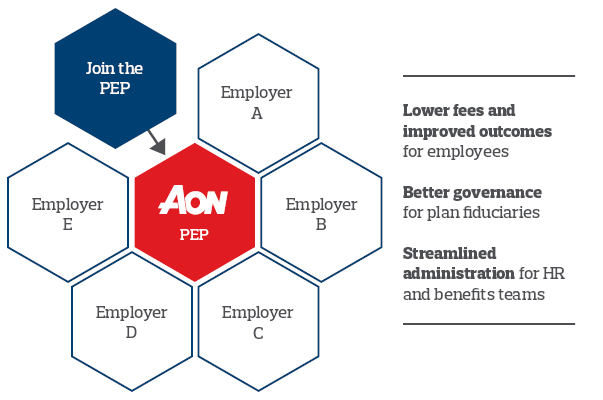 Most importantly, employers will be able to define their own plan design – ensuring they have the right benefits to effectively compete for talent in today’s competitive and dynamic employment environment. In addition, your organization will be able to transfer most fiduciary obligations and ongoing administrative duties to Aon as the PPP. However, you will still need to retain the fiduciary role of selecting a PEP and overseeing and monitoring the PEP and its performance.