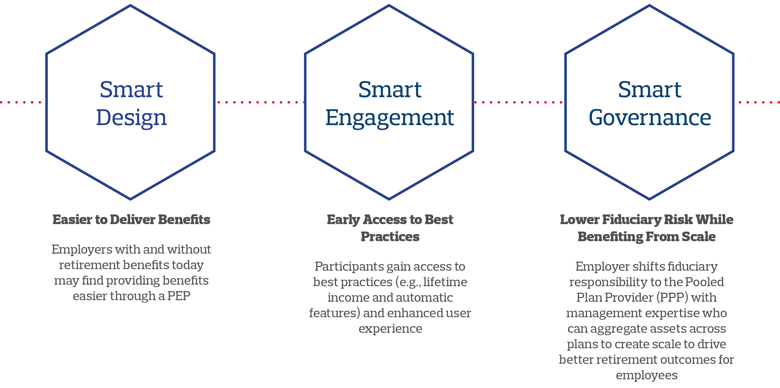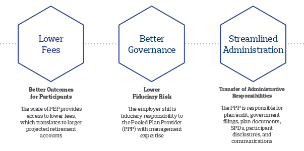 The PPP is also responsible for selecting and monitoring third-party vendors hired to deliver services for the PEP, including trustees/custodians, recordkeepers, investment managers and external advisors such as plan auditors. PEPs have emerged as an attractive alternative to traditional 401(k)s – reducing the work and risk involved in sponsoring a plan and offering significant opportunities for economies of scale and improved retirements for American workers.
