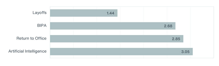 For EPL exposure, rank layoffs, artificial intelligence, BIPA, and return to office from most (1) to least (4) concerning. Underwriters view layoffs as the most concerning exposure, followed by BIPA, return to office, and artificial intelligence.