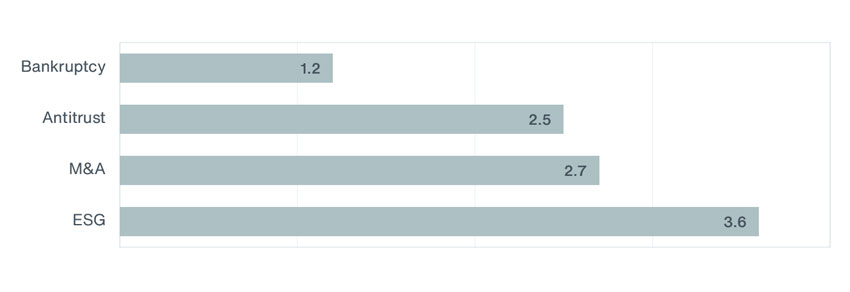 For D&O exposure, rank antirust, M&A, ESG, and bankruptcy from most (1) to least (4) concerning. Underwriters view bankruptcy as the most concerning exposure, followed by antitrust, M&A, and Environmental, Social and Corporate Governance (ESG).