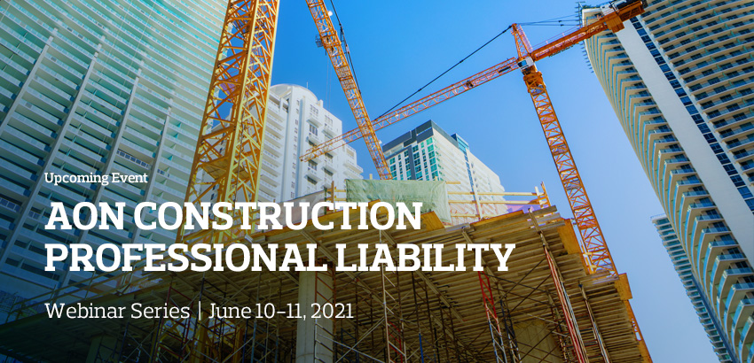 Aon’s Construction Professional Liability team would like to invite you to attend our four-part webinar series the mornings of June 10th and 11th 2021. All sessions are open to our clients, prospects and our insurer partners.