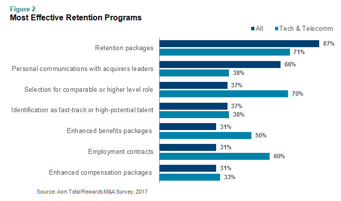Figure 2 highlights the formal retention programs that technology and telecommunications companies say are most effective during M&A. Some of the programs are much more important to technology companies compared to the general industry group in the survey, including selecting employees for comparable or higher-level roles, enhancing benefits packages and creating employment contracts. Retention compensation packages are still popular but not as widely used among technology companies in the survey.