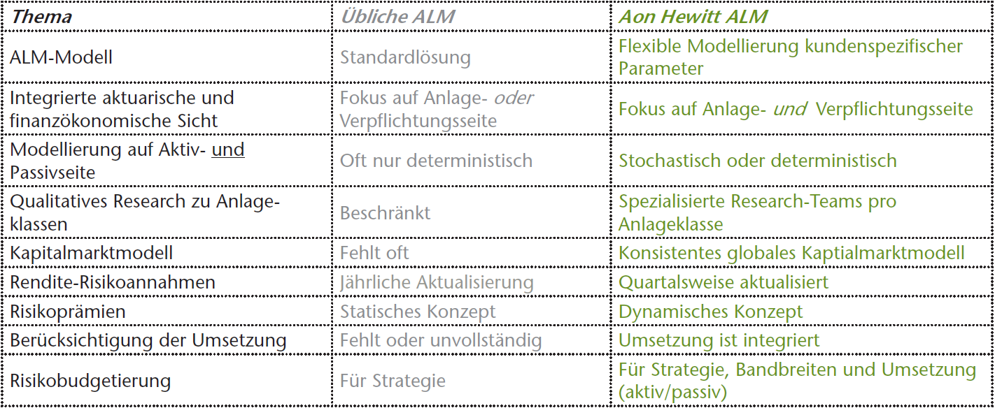 Unsere ALM-Studien sind banken- und versicherungsunabhängig und orientieren sich somit ausschliesslich am Kundeninteresse. Nachstehende Übersicht zeigt wichtige Unterschiede zwischen unseren ALM-Studien und den üblichen ALM-Studien auf: