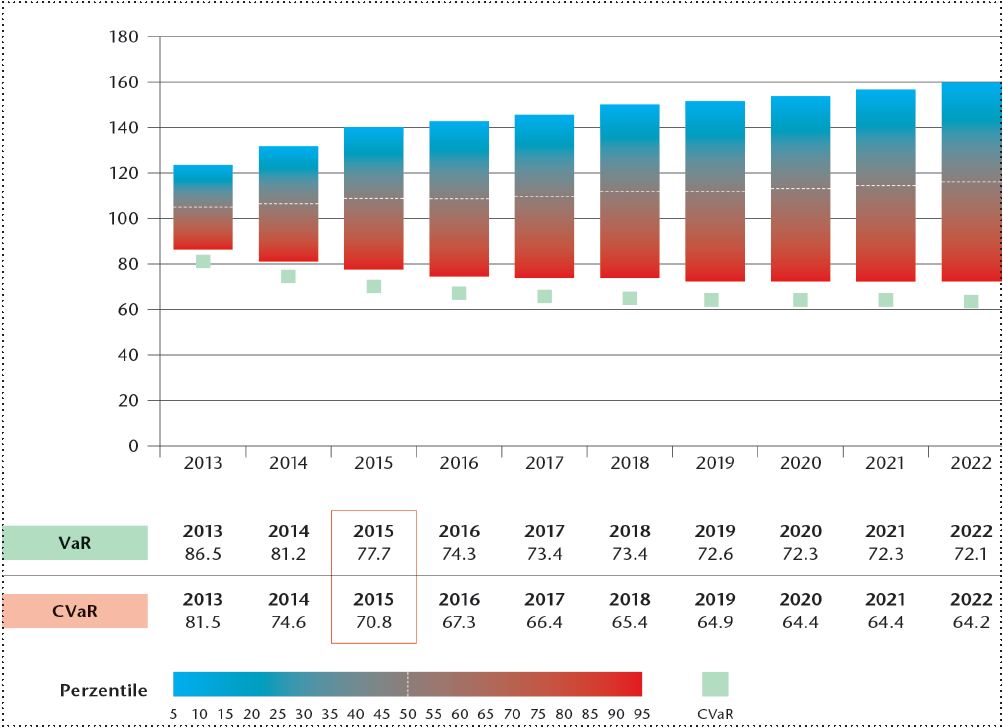 Der 95%-Value at Risk (VaR) Deckungsgrad im Jahr 2015 entspricht 77.7%. Mit einer Wahrscheinlichkeit von 95% wird ein Deckungsgrad von 77.7% demnach bis ins Jahr 2015 nicht unterschritten. Der Conditional Value at Risk (CVaR) Deckungsgrad im Jahr 2015 ist 70.8%. Wenn der Deckungsgrad im Jahr 2015 unterhalb des VaR liegt, dann liegt er im Erwartungswert bei 70.8%.