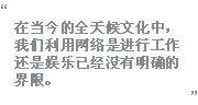 回想一下“万维网”首次进入我们日常工作时的情形。雇主迅速出台了关于使用互联网处理私人业务的限令。我们担心互联网的使用会降低公司的生产能力。紧随其后,雇主封锁了热门网站并建立防火墙。但是我们很快发现雇员整天使用手机和黑莓,却并不仅仅是用来相互联系,而是在忙于工作。