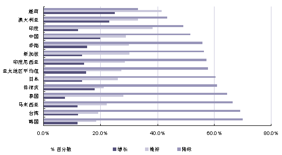 参与此次调研的亚太区119家高科技公司综合反映,全球金融危机给他们所带来的致命打击。有超过50%的公司表明他们的营业收入从2008年10至2009年6月间有大幅下滑。28%的公司的营收停滞不前。最糟糕的是韩国的高科技企业,69%的公司营收急剧降低,19%的公司没有增长。(见图1)