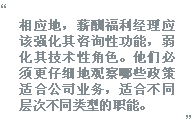相应地,薪酬福利经理应强化其咨询性功能,而适当弱化其技术性角色。他们必须更仔细地观察哪些政策适合公司业务,适合不同层次不同类型的职能。另外,如果一个组织依赖于外包、合同工、代理商和直销人员(这些在网络型的组织中变得越来越普遍),那么薪酬福利经理也应该了解公司非直属员工的薪酬福利状况。