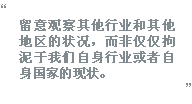 为此,我们的思维需要跳出原有的条条框框。仅仅追踪我们同行业中竞争对手,不太可能激发那些崭新的、创造性的思想。我们应该开始观察其他行业和其他地区的状况,而不是仅仅观察我们自身行业或者自身国家的现状。然后,分析如何能够将他们的经验运用到我们自己的业务中去。