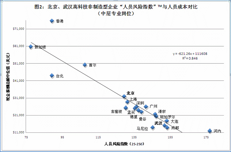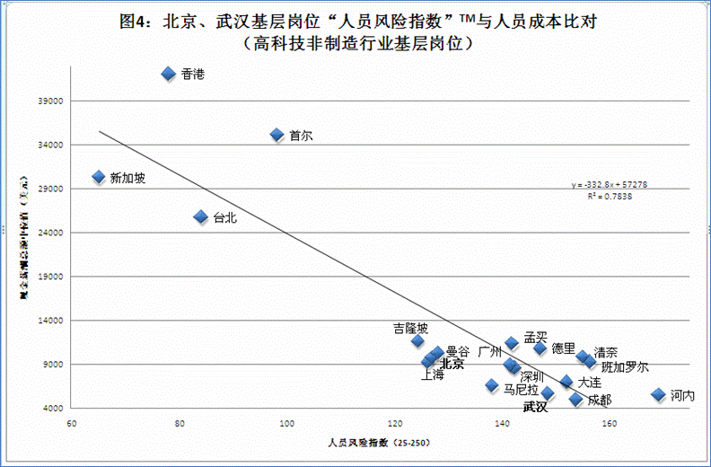 但是,如果结合北京、武汉及其他城市标杆岗位(这里为基层岗位)的年度现金薪酬总额,我们就得到了图4所示的“人员风险指数”TM与人员成本对比。借助“人员风险指数”TM与人员成本的回归分析线,我们却发现北京与武汉均在回归分析线下方,而北京离回归分析线的距离要大于武汉。这就意味着在高科技非制造行业,如果光就基层岗位的人员成本和风险比配而言,举例中的跨国企业尚没有急迫的理由离开北京迁往武汉,武汉在这个比配中并没有明显的优势。但是如果我们以同样的方法来分析该行业中中层专业岗位和高层管理岗位的人员成本与风险比配,我们会发现问题的症结其实是在高层管理岗位的人员成本与风险比配。换言之,高层人才的能力存量、水平及其转换成业务成果的可能性与相应的人员成本在北京的比配要劣于武汉的。而中层专业岗位又没有给北京提供多少人员成本与风险比配的优势。在这样的前提下,该跨国企业的选址决策的总体方向不一定会受到冲击,而分析过程本身却给企业管理层的决策提供了更为丰富的信息,并为人力资源部门对决策的实施提供了明确的方向与头绪。