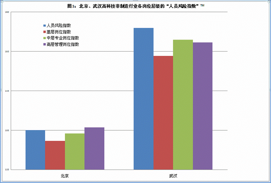 为了便于示范,我们将25个具体的人员风险因素根据高科技非制造行业中基层岗位、中层专业岗位和高层管理岗位的特点调整权重,得出了该行业在选址城市的不同岗位层级的“人员风险指数”TM水平(如图3所示)。在图中我们可以看到,北京的高层管理岗位给该企业带来了最大的人员风险。而对北京来讲最不用担心的是基层岗位的人员风险。我们再来看武汉,武汉给该企业可能带来的最大人员风险在中层专业岗位,而最不用担心的则是基层岗位。