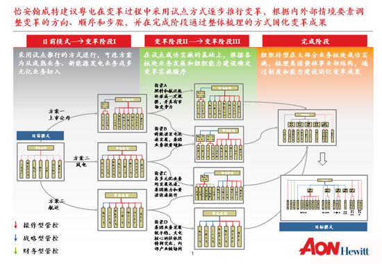 对于粤电集团这样一个居于国计民生核心产业中的大型国企而言,单纯对于未来模式和理想架构的设计是远远不够的,怡安翰威特提供的解决方案是一整套路线图式动态管理组件,其中包括多期间设计、阶段化发展路线图、触发机制和配套机制设置等。(如图)