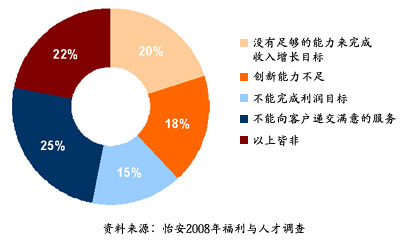 研究显示,公司已经察觉到领导力缺失的问题。在怡安咨询2008年福利与人才调查中, 56%的受访者表示,他们正面临合格领导人才的缺失,而去年这一数据仅为40%。这项调查同时显示了雇主对领导力极大的担忧,如下图显示: