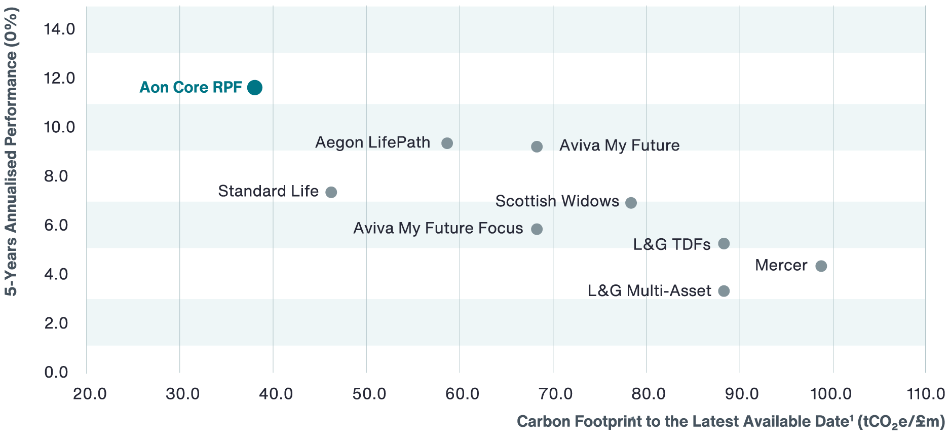 Source: Aon, Financial Express, Aegon. Data to 30 June 2024. Returns are based on information provided by the underlying providers to Financial Express and annualised for the five-year period to 30 June 2024. Performance is shown gross of fees and will be reduced by the charges paid by members. Please note past performance is not a guide to future performance. *Corporate Advisor ‘ESG in DC Pensions Report’ dated February 2024. Charts shows carbon footprint is based on scope 1 & 2 emissions provided by underlying providers at the latest available published date. **Inception date: 31 May 2015 – Aon Managed Core Retirement Pathway Funds.