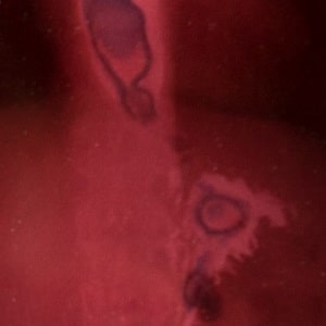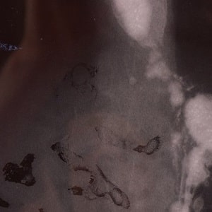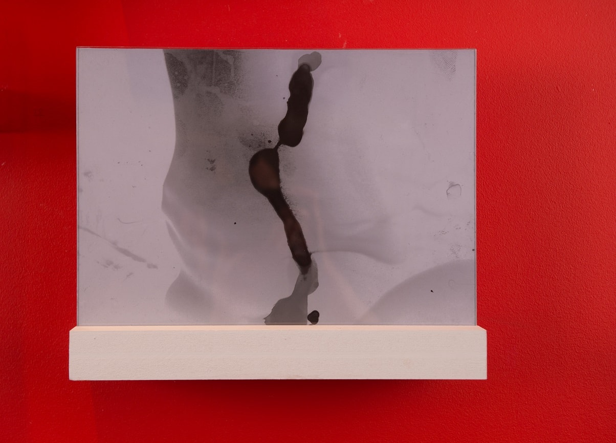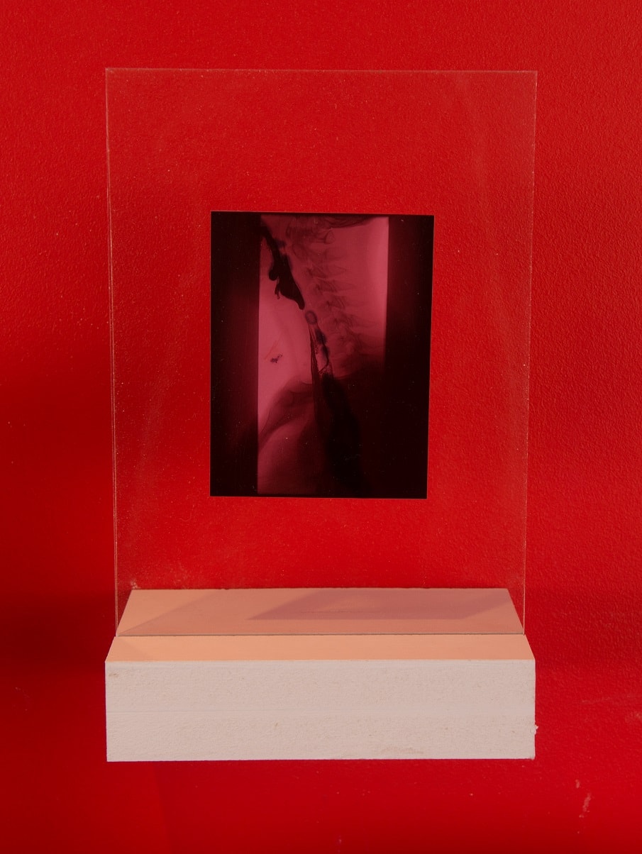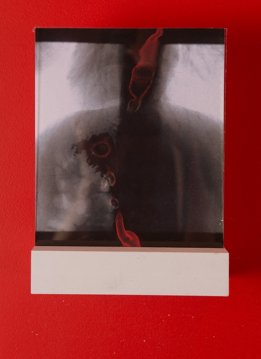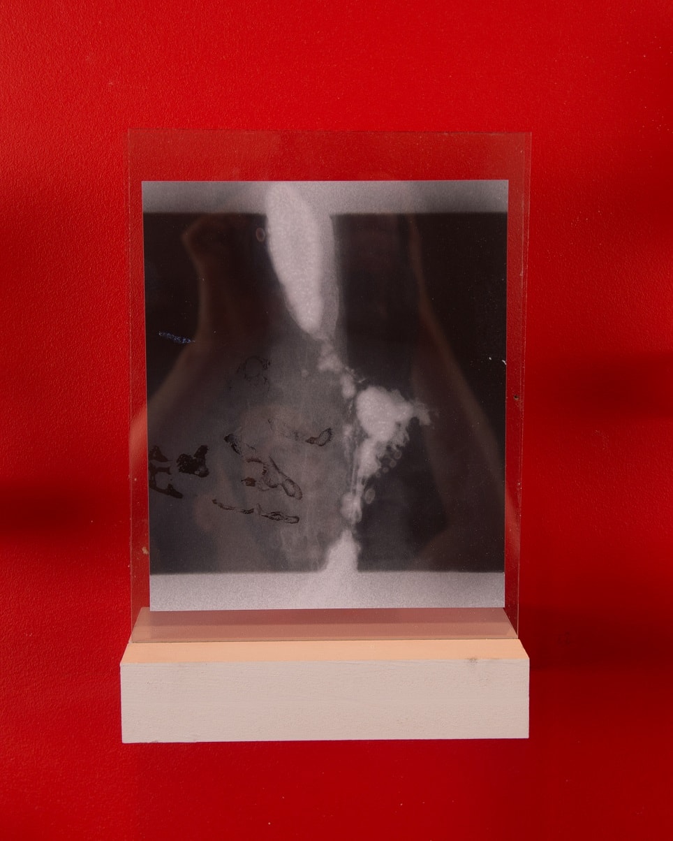 Being Here Between Unreachable Places' explores the relationship between the healing body and photography. X-ray images of fluids passing through the body are painted with cyanotype chemistry and exposed under sunlight, forming a distinctive blue mark inside the throat. When used as a photographic negative, the blue inverts into a physical red. The distant sun unites with the inner body, and so the realms of outside and inside meet.
