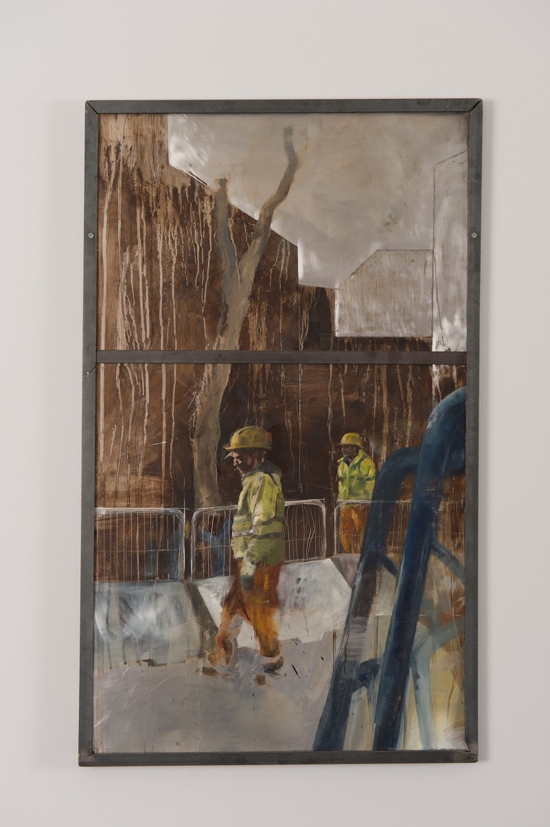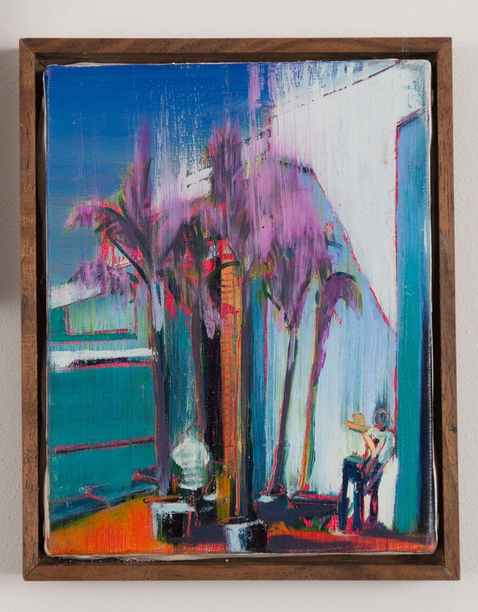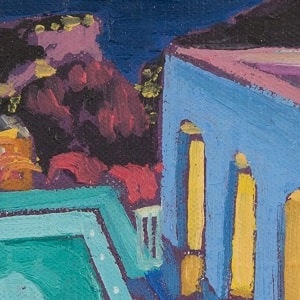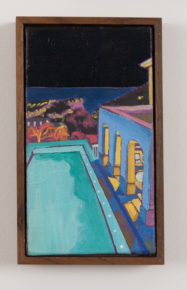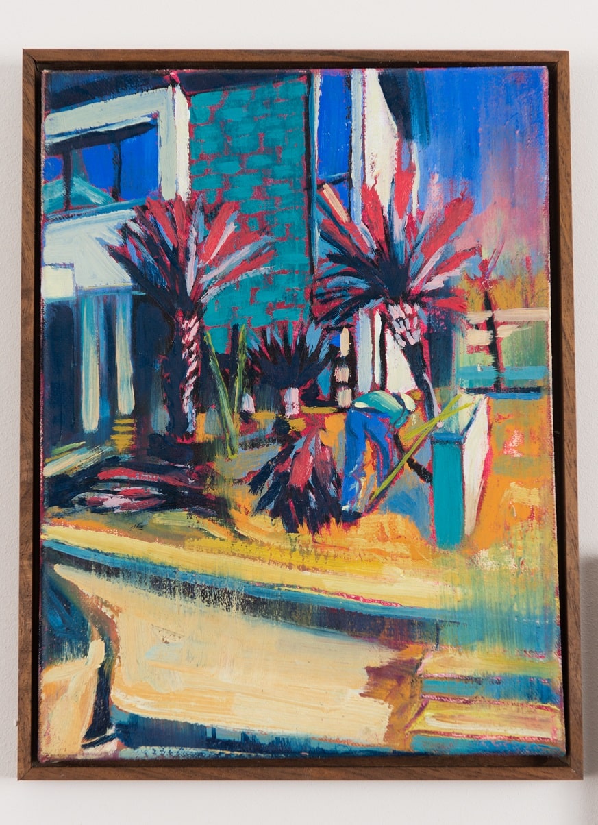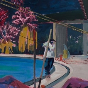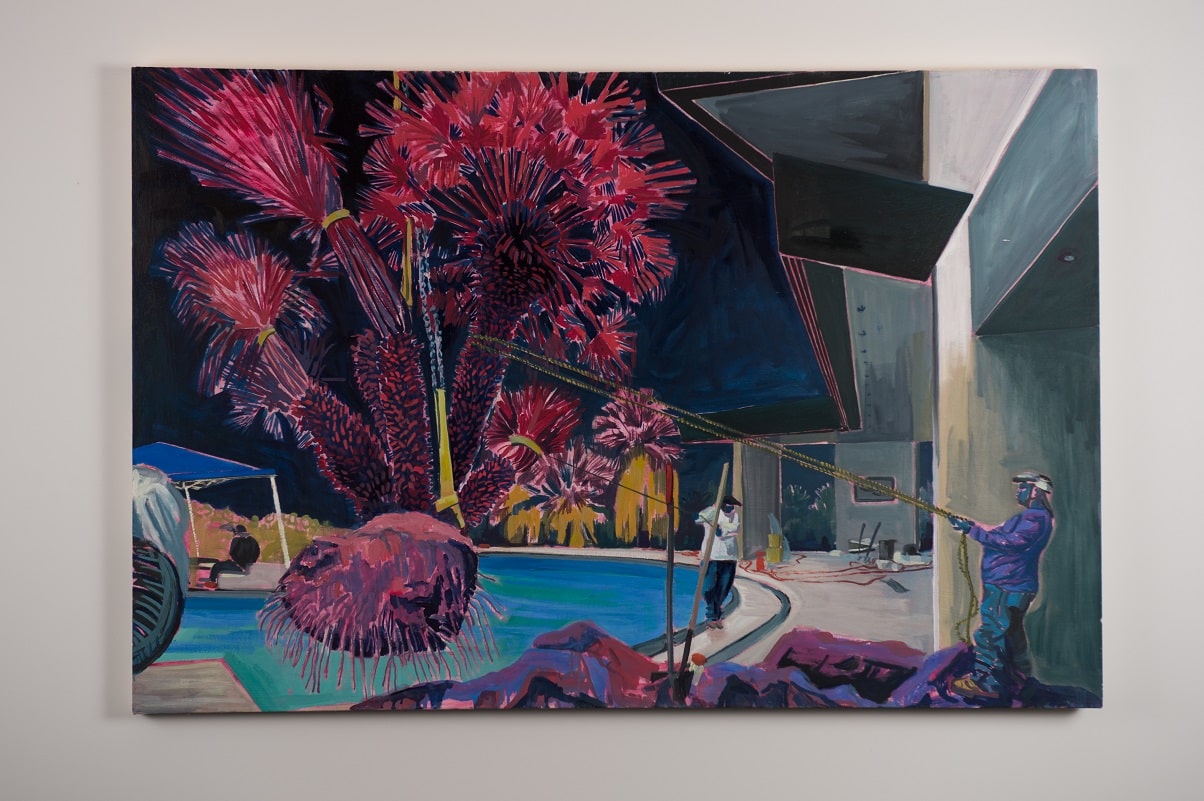 My work revolves around the exploration of interactions with domestic spaces in relation to ownership and aspiration. Compositions consist of rectilinear architectural forms and contemporary and historical motifs of aspiration and climate, such as swimming pools and palm trees. The depiction of tradesmen is intended to juxtapose the salubrious and dominant idealistic surroundings.