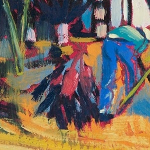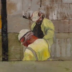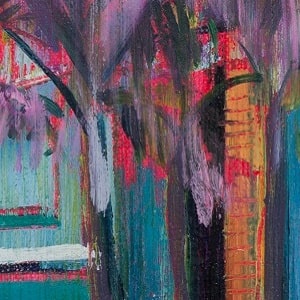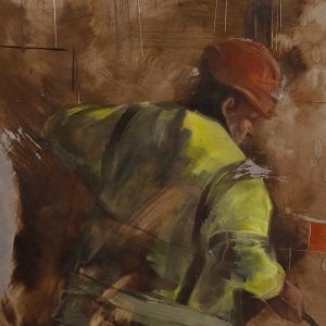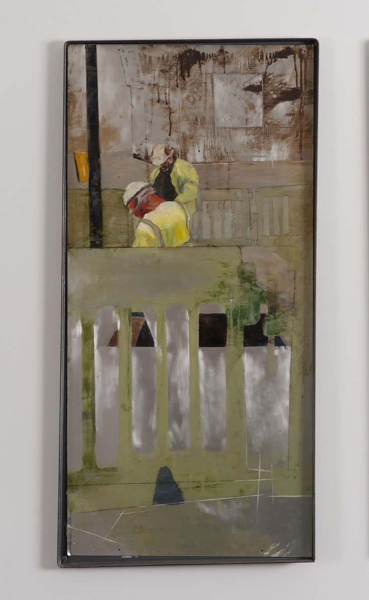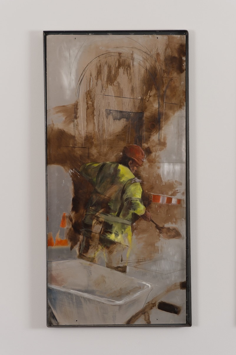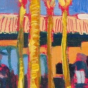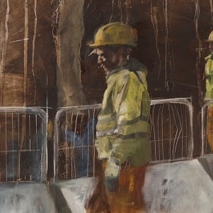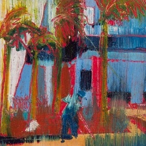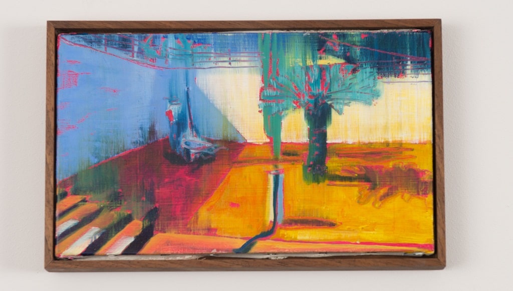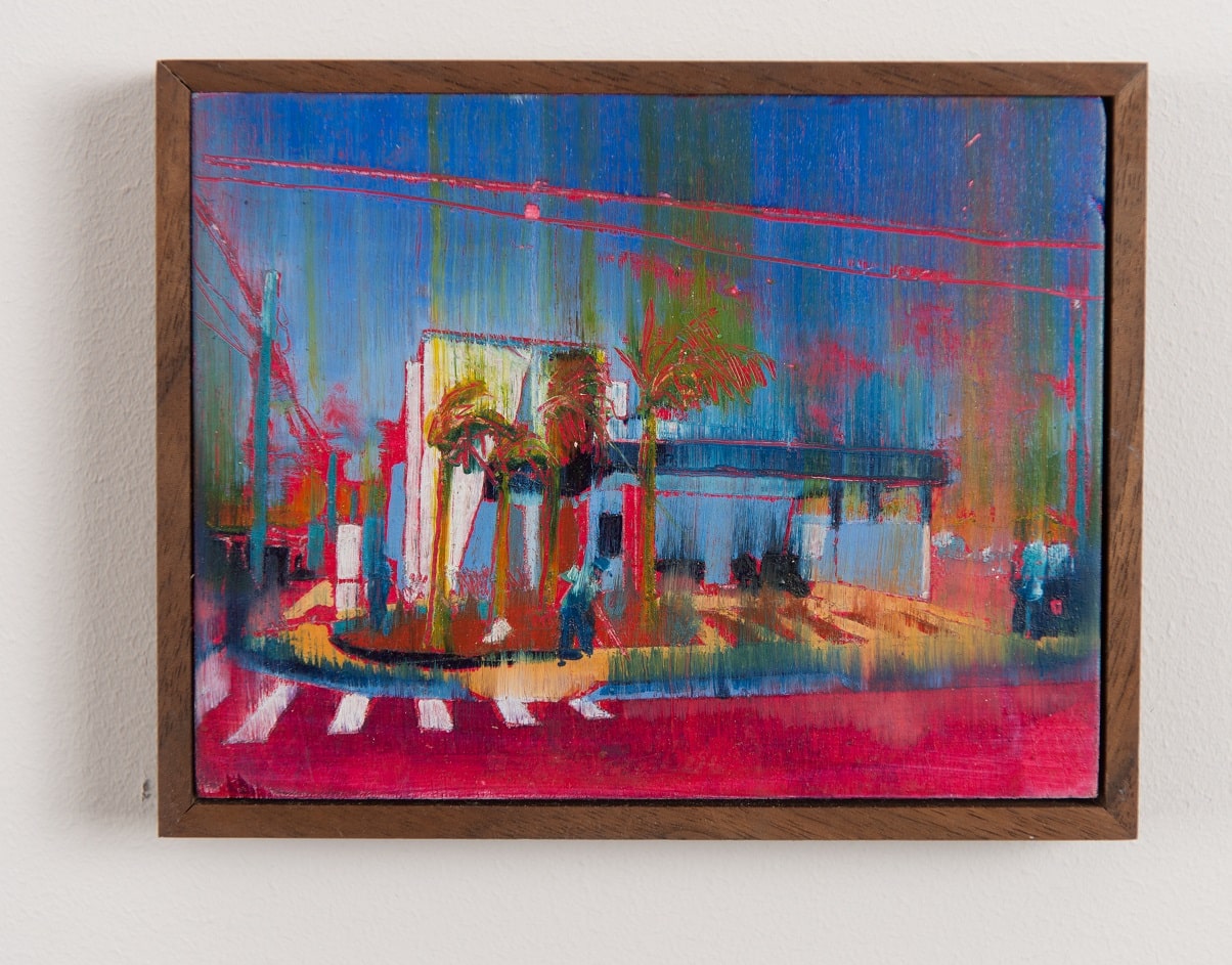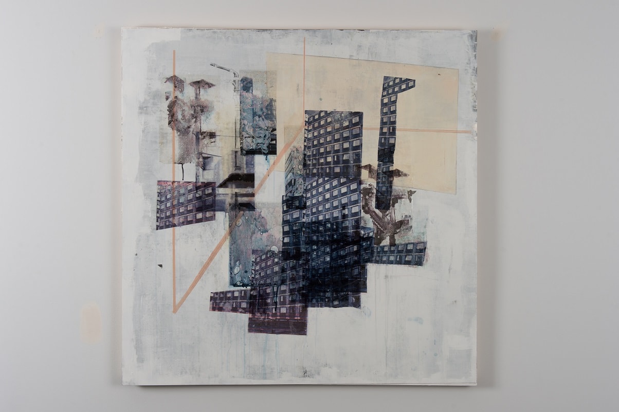 My work revolves around the exploration of interactions with domestic spaces in relation to ownership and aspiration. Compositions consist of rectilinear architectural forms and contemporary and historical motifs of aspiration and climate, such as swimming pools and palm trees. The depiction of tradesmen is intended to juxtapose the salubrious and dominant idealistic surroundings.