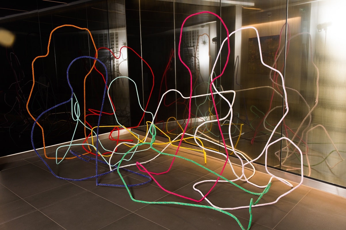 Henning’s sculptural practice materialises as welded steel rods, organic structures which reference bodily forms; the moving human figure and modernist, minimalist, formalist sculpture from history. The steel forms are intimately wrapped in brightly coloured yarn to reference the subjective embodied experience, with each separate colour anthropomorphising and individualising the work.
