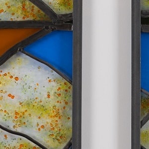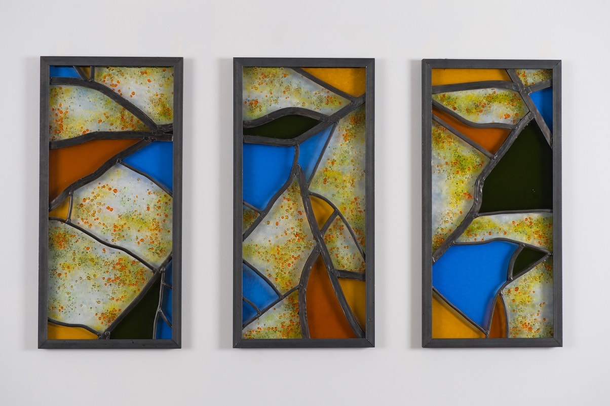 The contextual influences within my practice are the effect of sensory experiences on the mind and how art that reflects nature can affect our health and wellbeing. ‘Autumn Canopy’ is a contemporary spot lit piece, which uses the traditional handmade technique of leadlight. Designed for display within a healthcare environment, it is intended to create a calming and comforting space for the viewer.