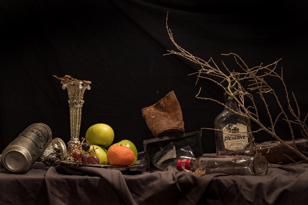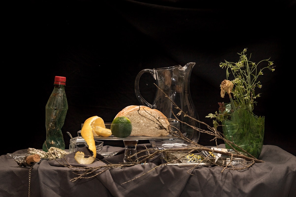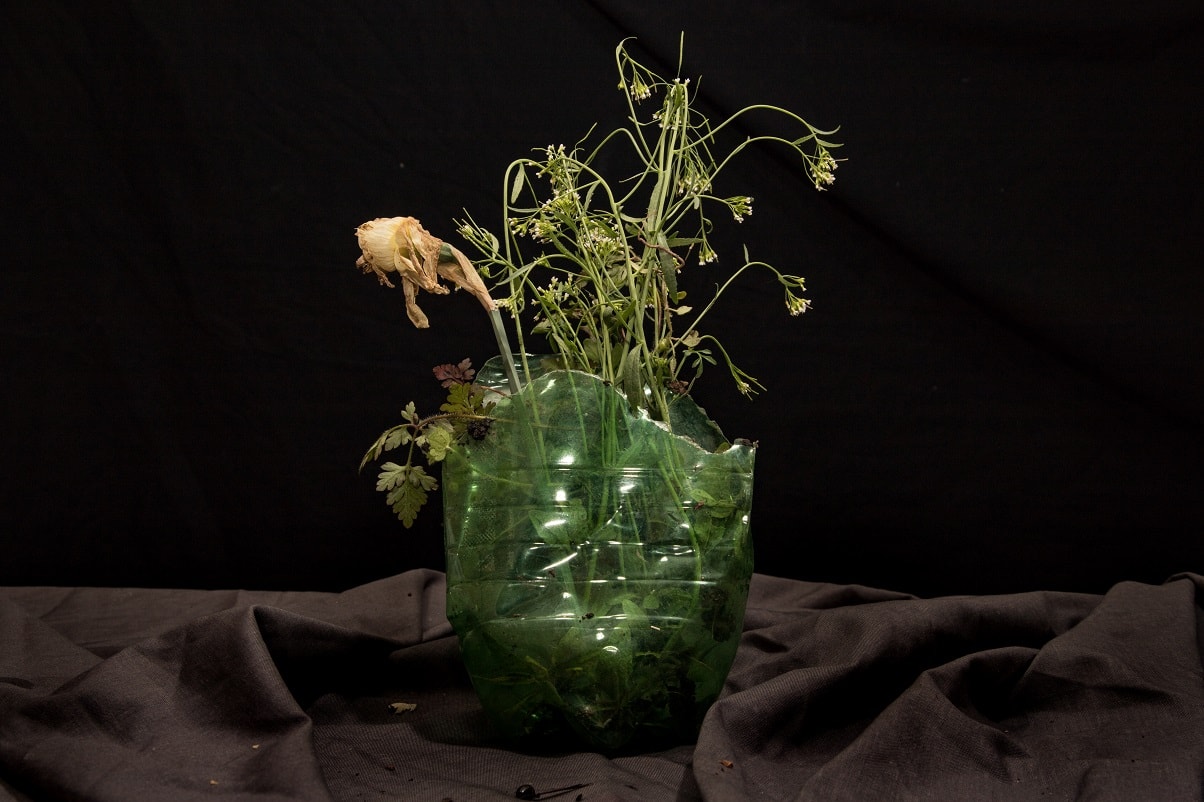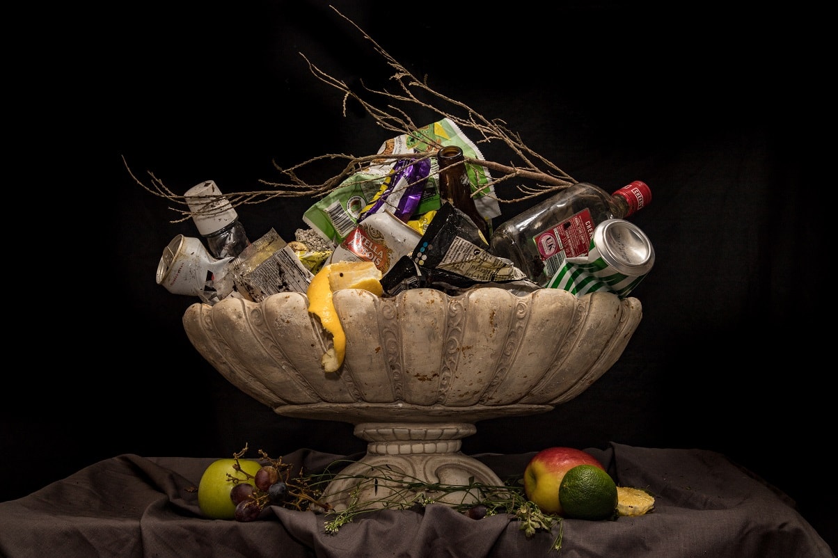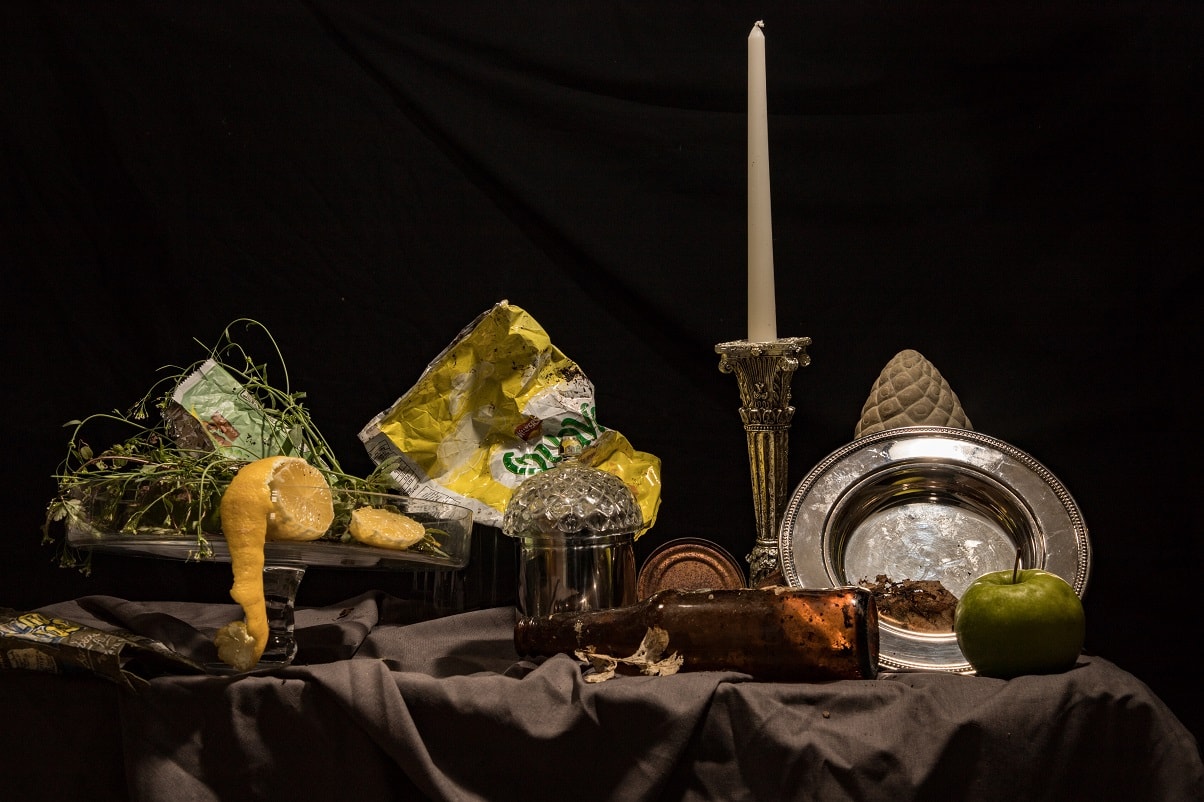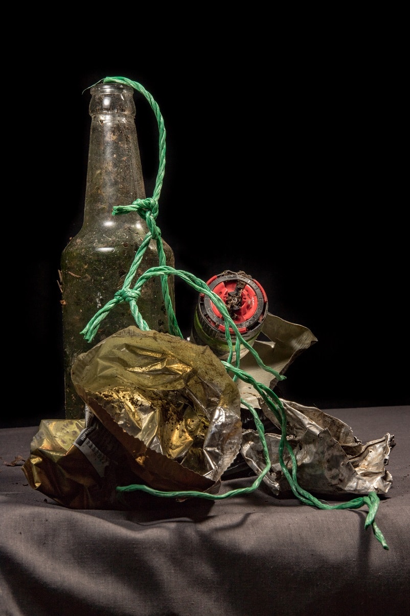 "Chloe Bromilow takes inspiration from Dutch still life from the Golden Age. She attempts to mimic the techniques from old masters, using photography and applying their practices to add a modern twist, using litter in place of the objects d’art. She invites the viewer to see this litter as elements of beauty, rather than the burden as we know it. Questioning; “Shouldn’t we all contemplate its problem on our world today?”