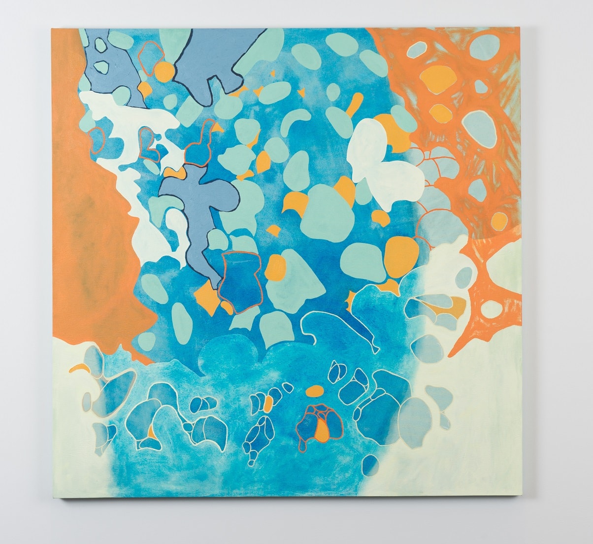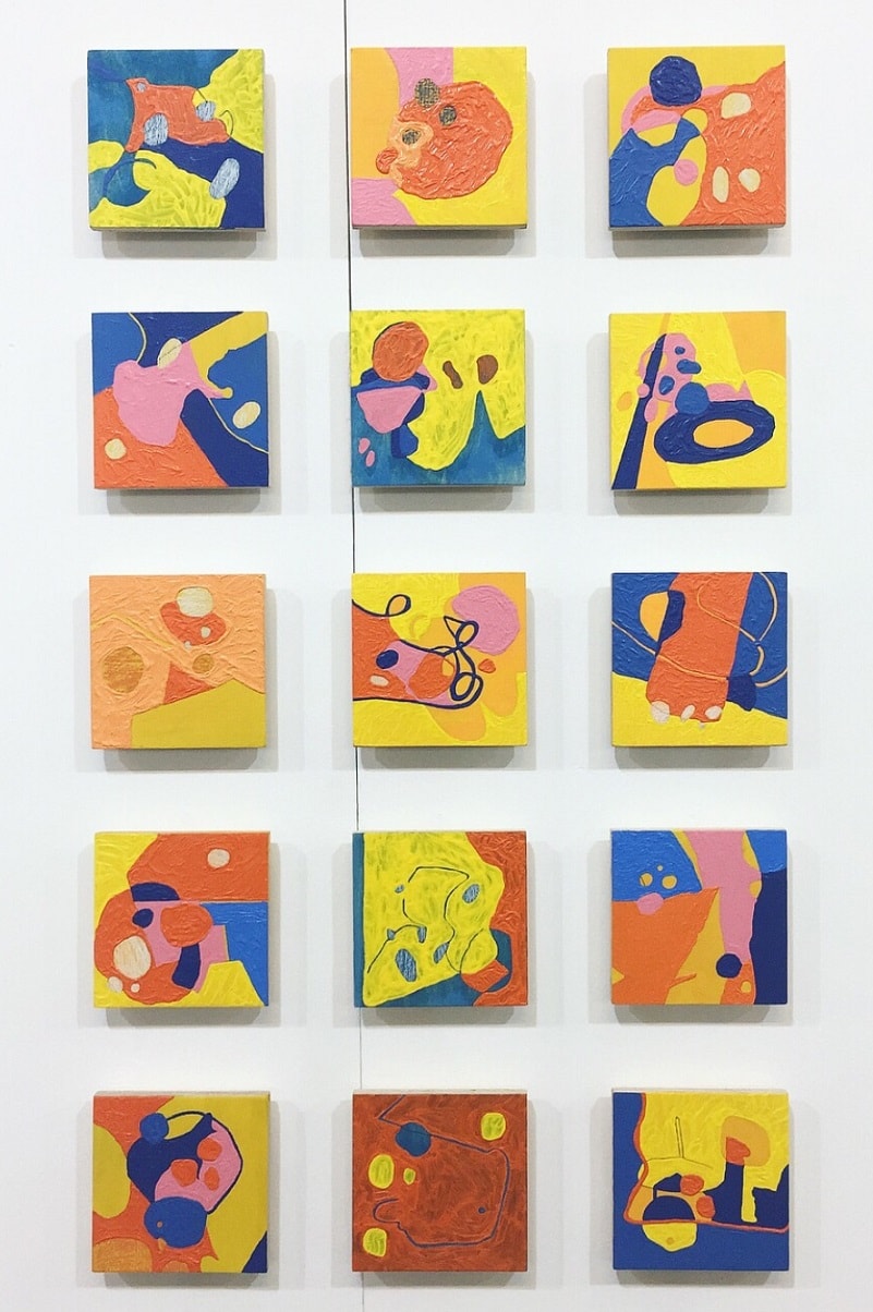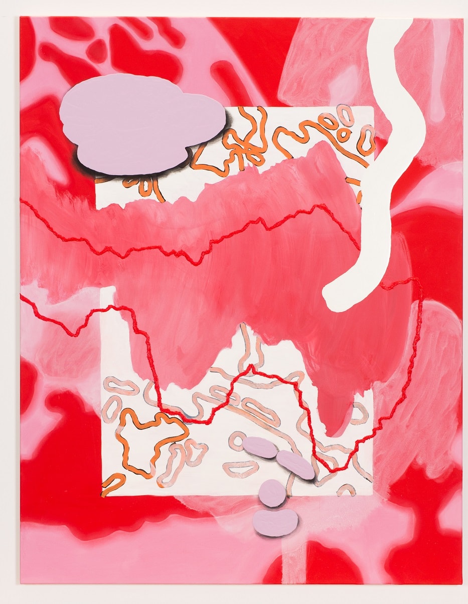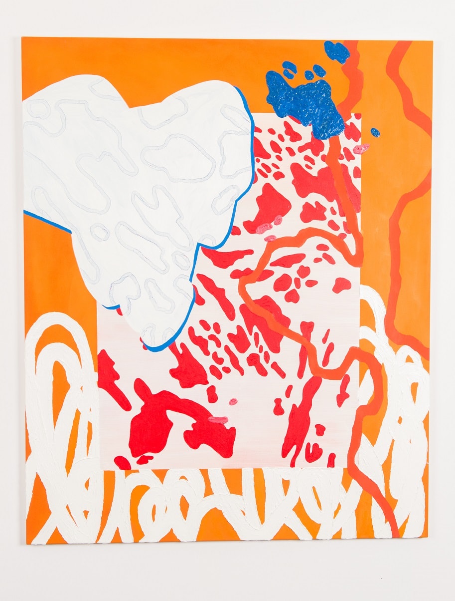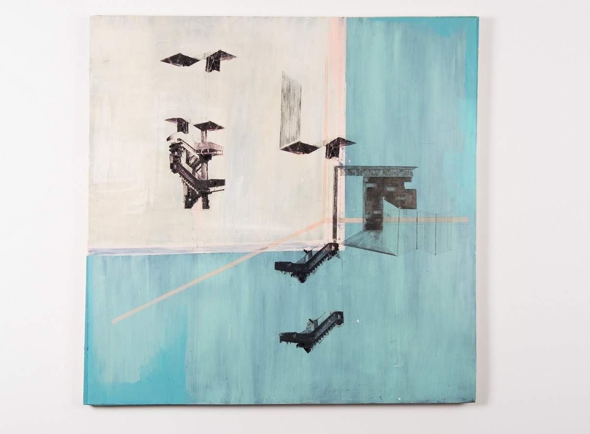 Luci Worrall is an abstract painter. She uses photography to select a section of an un-staged setting, she then traces the images – selecting only lines that become shapes. After scaling these drawings onto a surface, an intuitive colour palette then inhabits the shapes, infilling around the lines. What is created is an illusionistic space, where the elements of the painting appear to jostle within the boundaries.