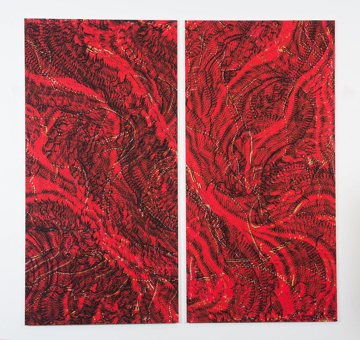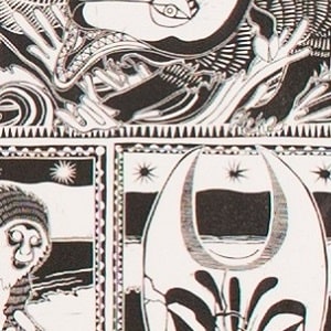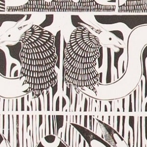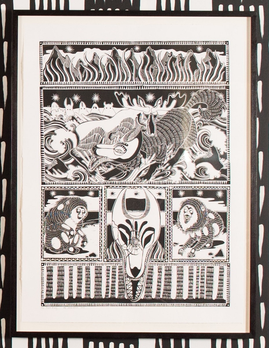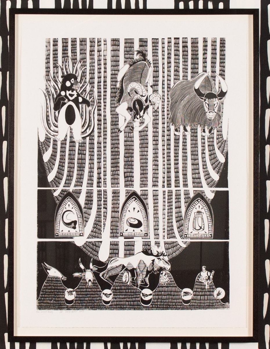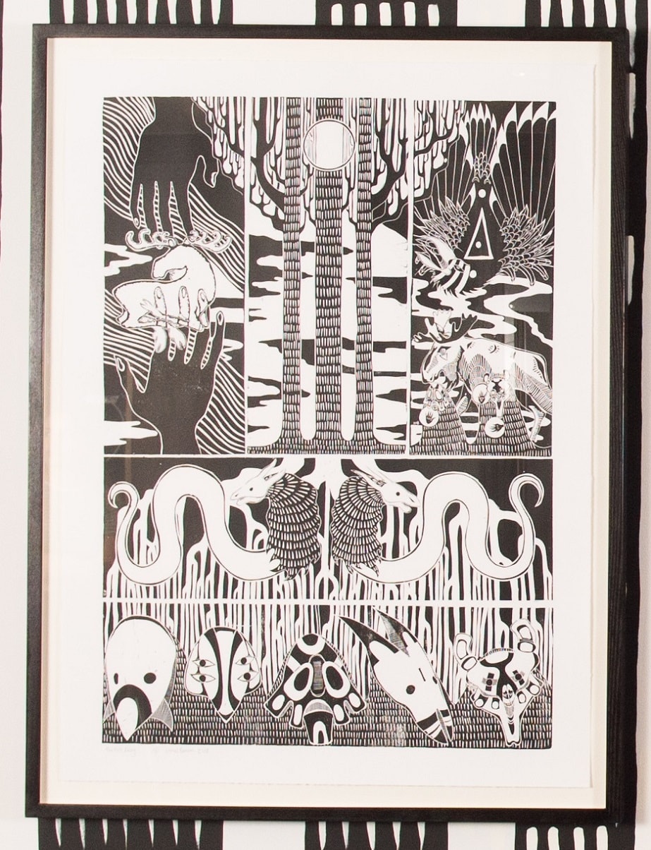 There are nineteen individually carved linocut panels in total, brought together in three large screen prints.