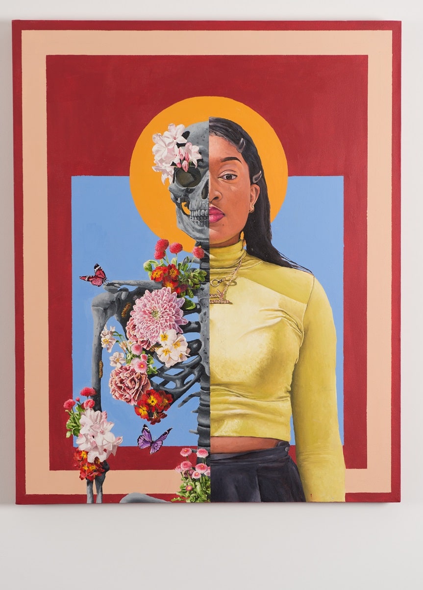 ‘Cassie’ and ‘Jasper’ are the first two paintings of a new project entitled ‘Black to the Bone.’ Revolving around the juxtaposition of a black skeleton with plant forms and life growing from it, the project is an expression of racial identity, and the importance of individuality. And will tackle subjects such as Representation, stereotypes, ideals of beauty, and notions of masculinity, within the black community.