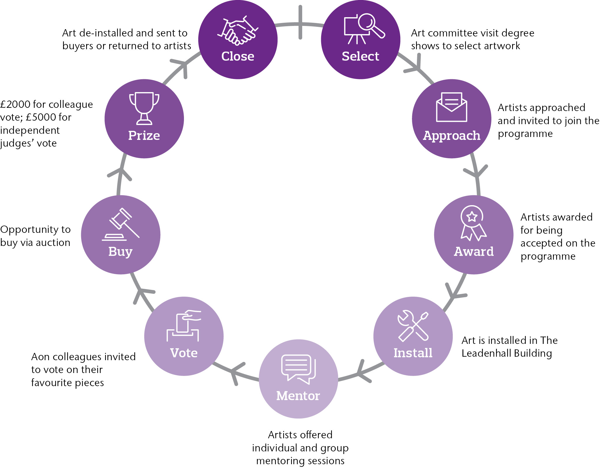 All selected artists also receive a cash award for being selected to be on the programme, and two cash prizes are awarded: a £5,000 prize to the artist selected by an external panel of judges as the most promising, and a £2,000 prize for Aon employees’ favourite piece of work.