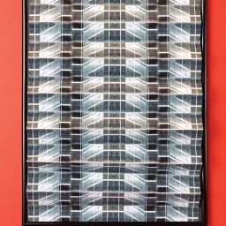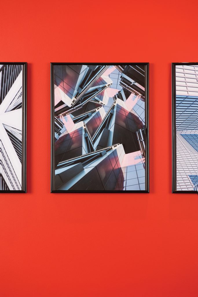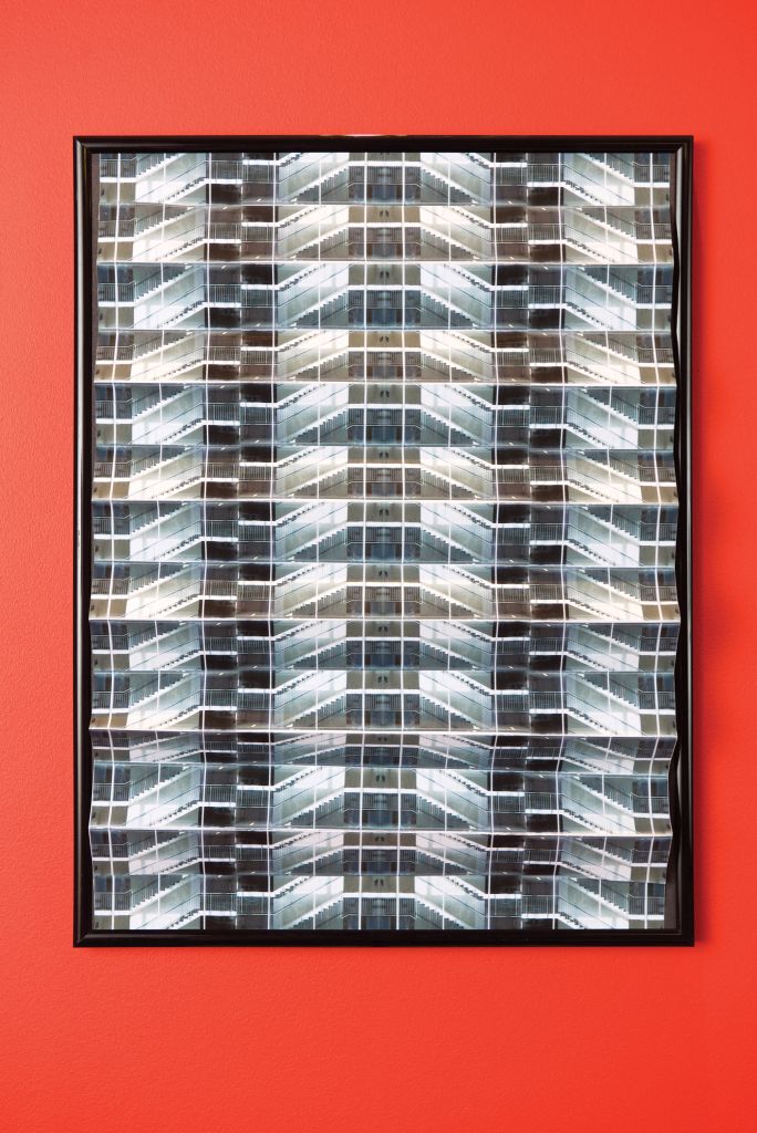 Miller's 'Deconstruction' is a photographic project using digital manipulation to distort imagery of modern architecture and exploring the deconstruction of architecture within growing urban environments. Miller uses graphic inspired imagery to produce 'new worlds' from a fresh perspective, creating aesthetic collages and designs. His work also experiments with a multi dimensional method, to enhance the subject's perspective. Some images are also presented onto rolls of fabric to express movement and scale.
