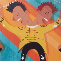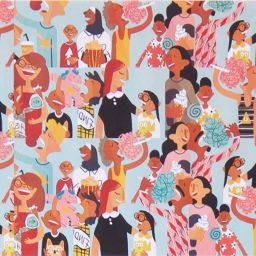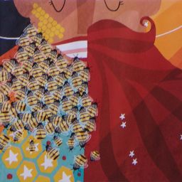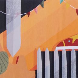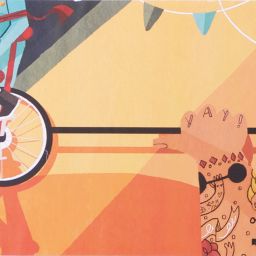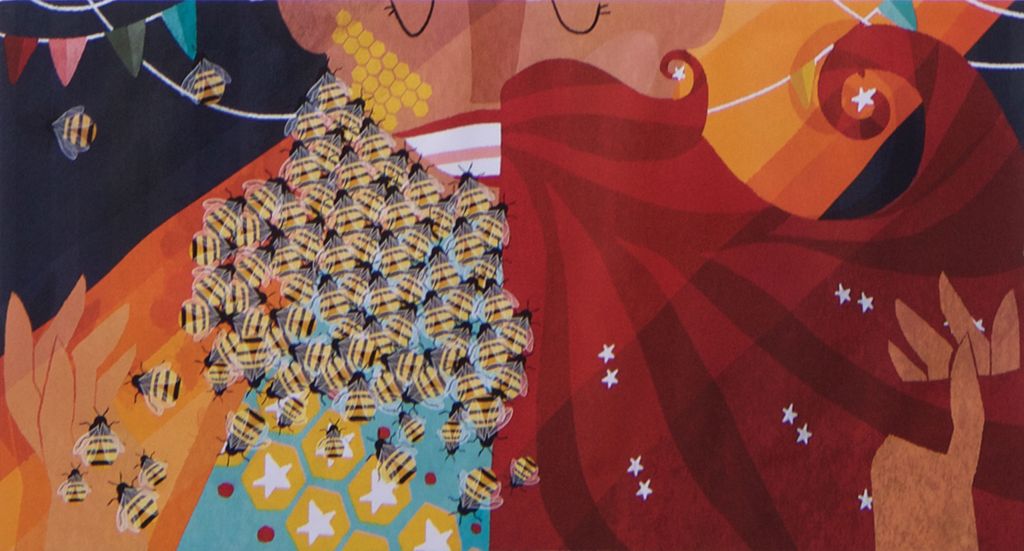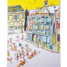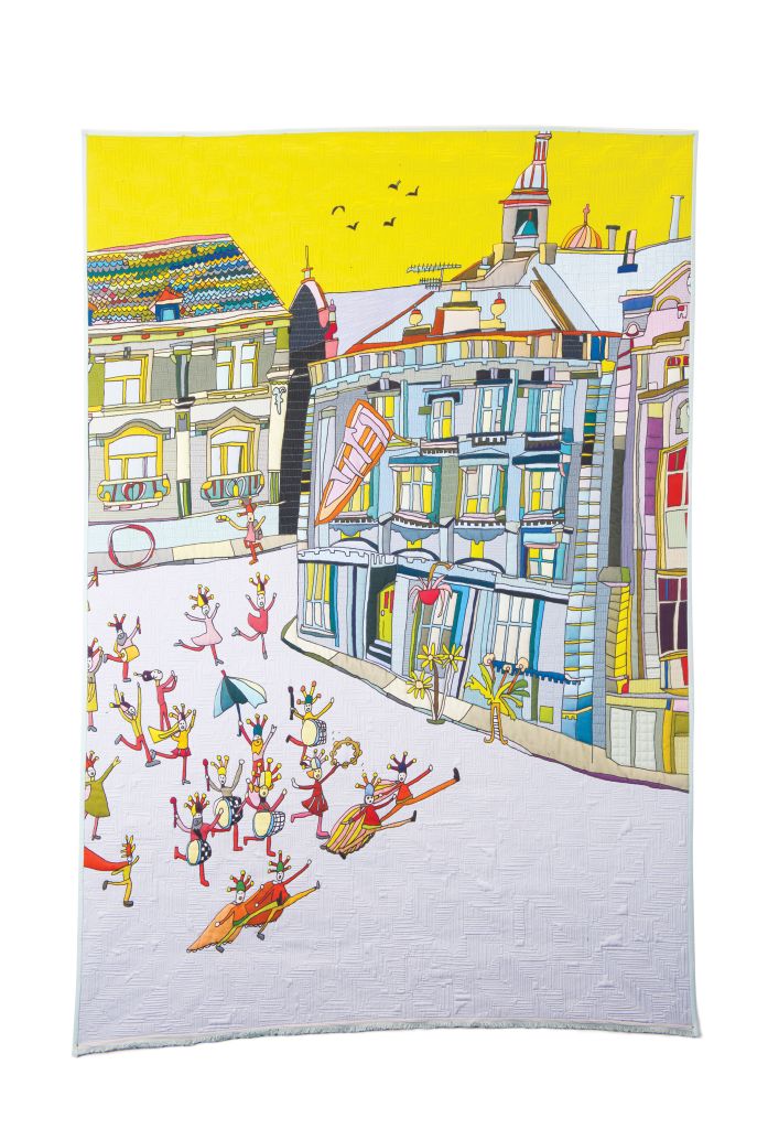 Though drawing, I am able to translate untouchable areas of my imagination. This piece is inspired by a particular experience I had at a parade in Bratislava, Slovakia. I wanted to play with the characters and atmosphere with my cheerful, illustrative and colourful style. Using my instinctive eye for colour and experimenting with quilting I have been able to bring the drawing to life.