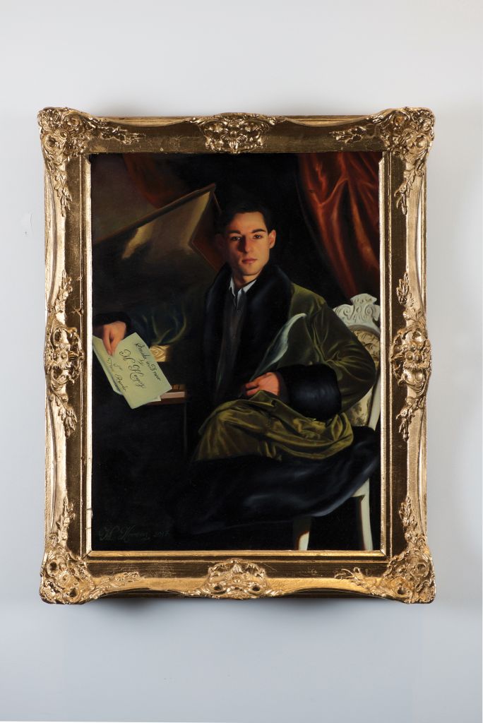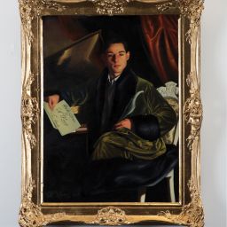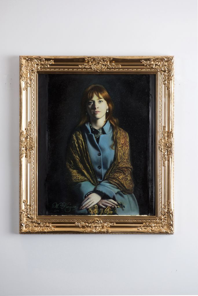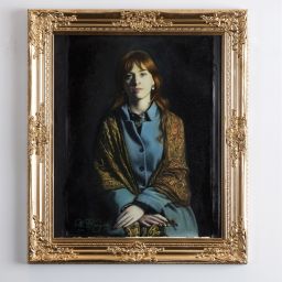 On the day of the sitting Elena was posing as a nude Venus for Koropisz's painting. At the end of the session she asked if he would also paint her clothed as a gift to her Mother. In this result, she sits face-on and direct. Her blue coat contrasts with the detail of the shawl, as her piercing eyes draw the viewer in.